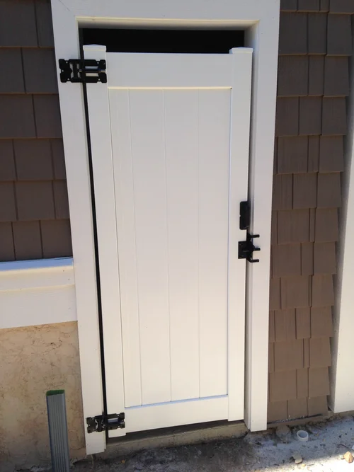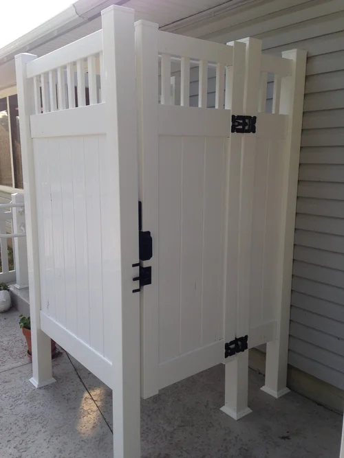 Hanging out at the beach all day can have a few negatives (yeah right) But seriously, Sunburn being one and sand being the other. Washing off the salt and sand can really put some wear and tear on the plumbing in your home. By installing a vinyl shower enclosure you can help keep sand under control. If your Privacy is a concern, we can install a roof or decorative Pergola Top to help with that!